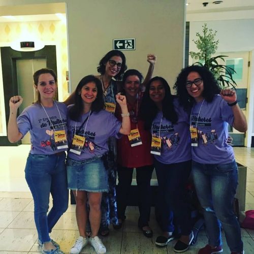 Nas imagens, a delegação da seção São Paulo: Daniele (Catanduva), Selma (Campinas), Márcia (Jacareí), Isabel (Votuporanga), Juliana (Hortolândia) e Tatiane (Catanduva). A pequena Olívia faz parte da nossa delegação mirim. Durante a atividade, as crianças filhas das participantes participaram de uma ciranda, além de outras brincadeiras, garantindo a participação política das companheiras que são mães.