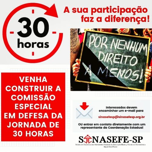 Faça parte da COMISSÃO ESPECIAL EM DEFESA DAS 30 HORAS! Venha ajudar a construir estratégias de luta. Direitos não se negociam!