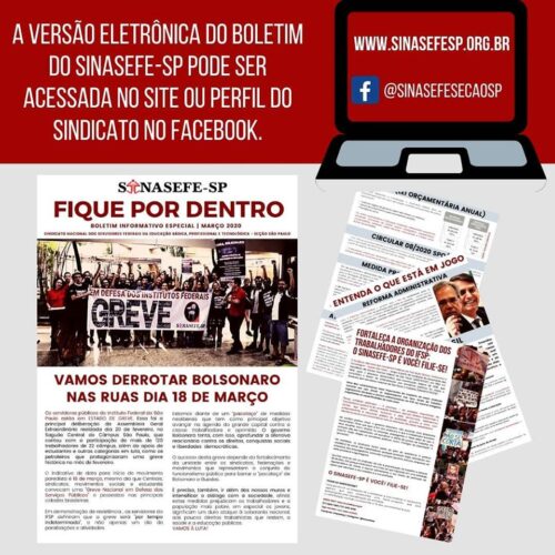 Os servidores públicos do Instituto Federal de São Paulo estão em ESTADO DE GREVE. O indicativo de data para início do movimento paredista é 18 de março, mesmo dia que Centrais, sindicatos, movimentos sociais e estudantis convocam uma “Greve Nacional em Defesa dos Serviços Públicos” e passeatas nas principais cidades brasileiras.