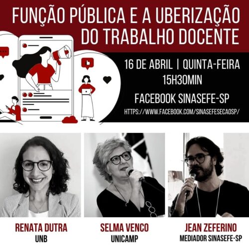 O primeiro programa tem como tema: “Função pública e a uberização do trabalho docente” com a contribuição das professoras Selma Venco e Renata Dutra.
