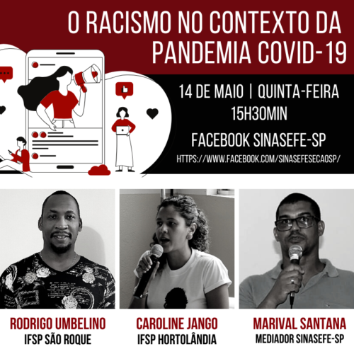 Nesta quinta-feira (14 de maio), o tema do programa será “O Racismo no Contexto da Pandemia Covid-19” com a contribuição dos professores Caroline Jango e Rodrigo Umbelino.