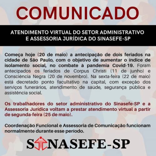 Os trabalhadores do setor administrativo do Sinasefe-SP e a Assessoria Jurídica voltam a prestar atendimento virtual a partir de segunda-feira (25 de maio).