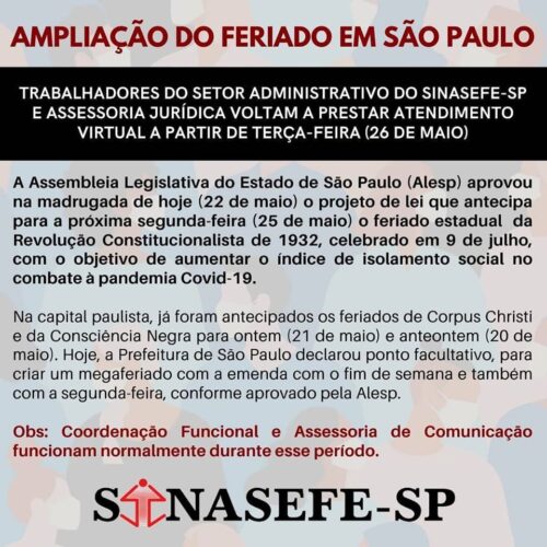 A Assembleia Legislativa do Estado de São Paulo (Alesp) aprovou na madrugada de hoje (22 de maio) o projeto de lei que antecipa para a próxima segunda-feira (25 de maio) o feriado estadual da Revolução Constitucionalista de 1932, celebrado em 9 de julho, com o objetivo de aumentar o índice de isolamento social no combate à pandemia Covid-19.