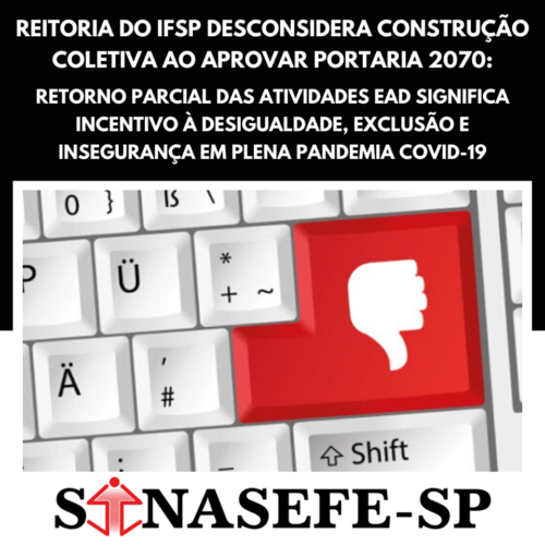A Reitoria do Instituto Federal de São Paulo aprovou a Portaria 2070 de 29 de maio autorizando a retomada dos calendários acadêmicos dos cursos que tenham a carga horária em EaD (Ensino à Distância) previstas no PPC (Projeto Pedagógico do Curso) desconsiderando inúmeras contribuições da comunidade acadêmica sobre o tema, cujo objetivo se estabelecia na garantia de condições adequadas de trabalho e educação para discentes e trabalhadores docentes e técnico-administrativos.