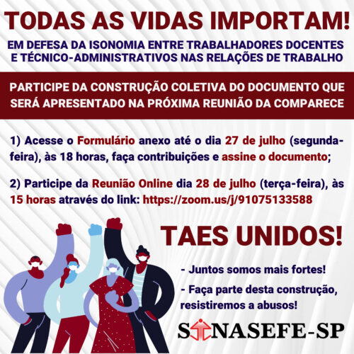 Simultaneamente, houve uma grande mobilização de servidoras e servidores TAES, especificamente dos setores sociopedagógicos do IFSP, que diante da constatação de que pelo menos 12 campi não teriam sido consultados para a suas contribuições, organizaram um documento que analisou ponto a ponto a minuta e assim puderam enviá-lo para as discussões do último COMPARECE, na sexta-feira, dia 17 de julho.
