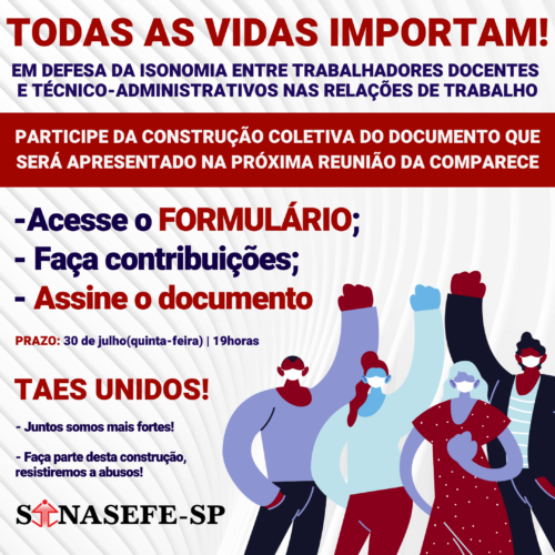 Disponibilizamos aqui um FORMULÁRIO para que todas e todos servidores TAES enviem suas colaborações sobre a Minuta, que possam enriquecer o documento já produzido, que será apresentado na próxima COMPARECE.