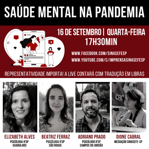 A transmissão será iniciada às 17h30min desta quarta-feira, 16 de setembro, simultaneamente no Canal Imprensa Sinasefe-SP do Youtube e também na página do sindicato no Facebook: