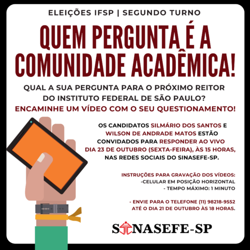 Os candidatos SILMÁRIO DOS SANTOS e WILSON DE ANDRADE MATOS estão convidados para responder AO VIVO dia 23 de outubro (sexta-feira), às 15 horas, com transmissão simultânea no Canal Imprensa Sinasefe-SP do Youtube e na página do sindicato no Facebook:
