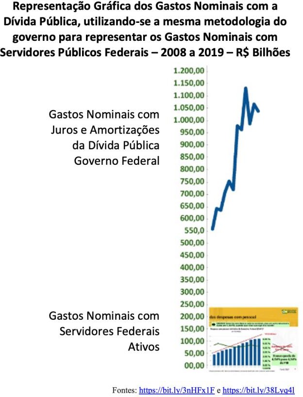 A distorção dos dados apresentados pelo governo é tão aberrante que, caso fôssemos representar os gastos com juros e amortizações da dívida pública federal na mesma escala usada pelo governo para representar os gastos com os servidores, assim ficaria a representação gráfica:
