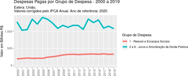Quando representamos tanto o gasto com pessoal como os gastos com a chamada dívida pública em dados corrigidos pelo IPCA nos últimos 20 anos, temos a nítida visualização de qual é o gasto delinquente que precisa ser reformado: a curva azul que representa os gastos financeiros com juros e amortizações da dívida e seus saltos, que coincidem com a produção de crises e desequilíbrios fiscais, econômicos e sociais. É AÍ QUE ESTÁ O PROBLEMA DAS CONTAS PÚBLICAS!