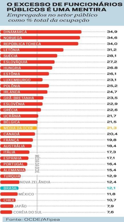 Segundo estudo difundido pela OCDE/Afipea, refletido no gráfico seguinte, entre outros estudos (disponíveis por exemplo em https://bit.ly/3ifttUd e https://bit.ly/2XHqElG), no Brasil somente 12,1% da população ocupada é empregada no setor público, enquanto nos países componentes da OCDE a média de empregados absorvidos pelo setor público representa 21,3% da população ocupada. Essa taxa ultrapassa 34% em países como Dinamarca e Noruega.
