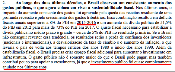 Em outro trecho de seu estudo o Banco Mundial aponta a relevante queda do PIB em 2015- 2016, a explosão da dívida pública e outros fatores, para concluir que o investimento público ficou anulado nos últimos anos e que, se não for feito drástico ajuste fiscal, a situação não se estabilizaria, repetindo um receituário que nunca deu certo em lugar algum do planeta! O trecho com a argumentação do Banco Mundial pode ser lido a seguir: