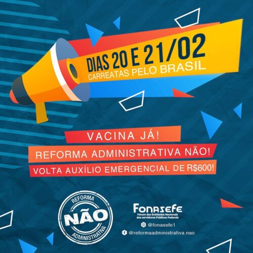 CARREATAS | Se o Brasil continuar a vacinar no ritmo atual, só vai ter terminado de imunizar toda a população contra a COVID-19 em 2024. Se a Reforma Administrativa (PEC 32) for aprovada no Congresso, será um passo grande na destruição dos serviços públicos gratuitos aos que mais necessitam. Se o auxílio emergencial não voltar com seu valor integral de R$600,00, 63 milhões de brasileiros entrarão em condições de extrema pobreza. Por isso, a luta do povo não pode parar. Nos dias 20 e 21 de fevereiro (sábado e domingo) serão realizadas carreatas de protesto por todo o país.