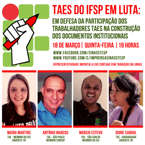 A transmissão ao vivo acontecerá simultaneamente no Canal Imprensa Sinasefe-SP do Youtube e também na página do sindicato no Facebook: