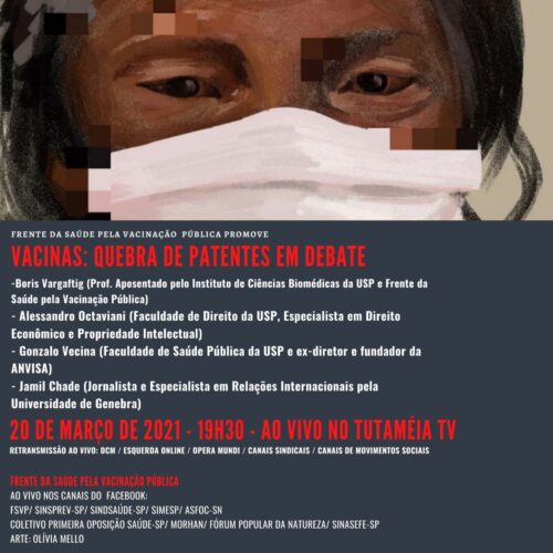 Neste sábado (20 de março), às 19 horas, vamos retransmitir na página do sindicato no Facebook uma live que vai contar com a participação dos professores/pesquisadores Boris Vargaftig, Alessandro Octaviani, Gonzalo Vecina e do jornalista Jamil Chade. O tema em questão será a quebra de patentes no Brasil. Participe e ajude a divulgar!