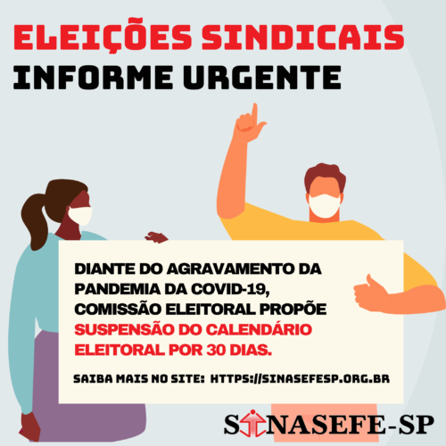 Suspende o início das inscrições de chapa e propõe a suspensão do calendário eleitoral do SINASEFE-SP por 30 dias. Essa decisão precisa ser submetida à Assembleia Geral que será convocada nos próximos dias