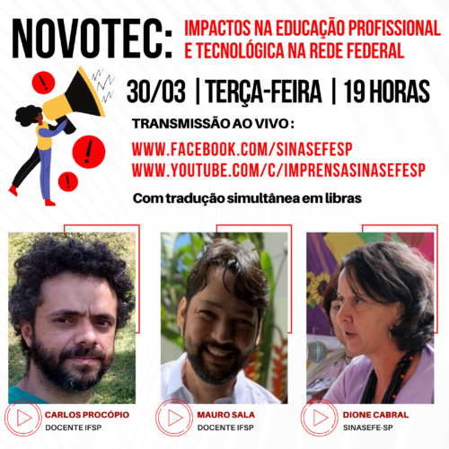 No programa da próxima terça-feira, 30 de março, vamos debater o processo de implementação da Reforma do Ensino Médio a partir do programa NOVOTEC, que introduz o itinerário profissionalizante no sistema público estadual de ensino paulista. É fundamental que a comunidade acadêmica do IFSP amplie as discussões e a luta contra propostas que, na prática, contribuem para uma formação desigual voltada para um mercado de trabalho cada vez mais precarizado.
