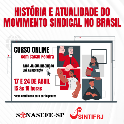O SINTIFRJ e o Sinasefe-SP abrem inscrições para o Curso Online “História e Atualidade do Movimento Sindical no Brasil”, com Cacau Pereira*, nos dias 17 e 24 de abril , das 15 às 18 horas através da Plataforma Zoom. Serão disponibilizadas gratuitamente um total de 40 vagas, sendo 20 vagas reservadas para cada seção sindical organizadora. A participação no curso dá direito a certificado.