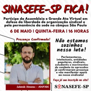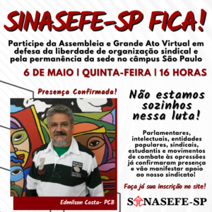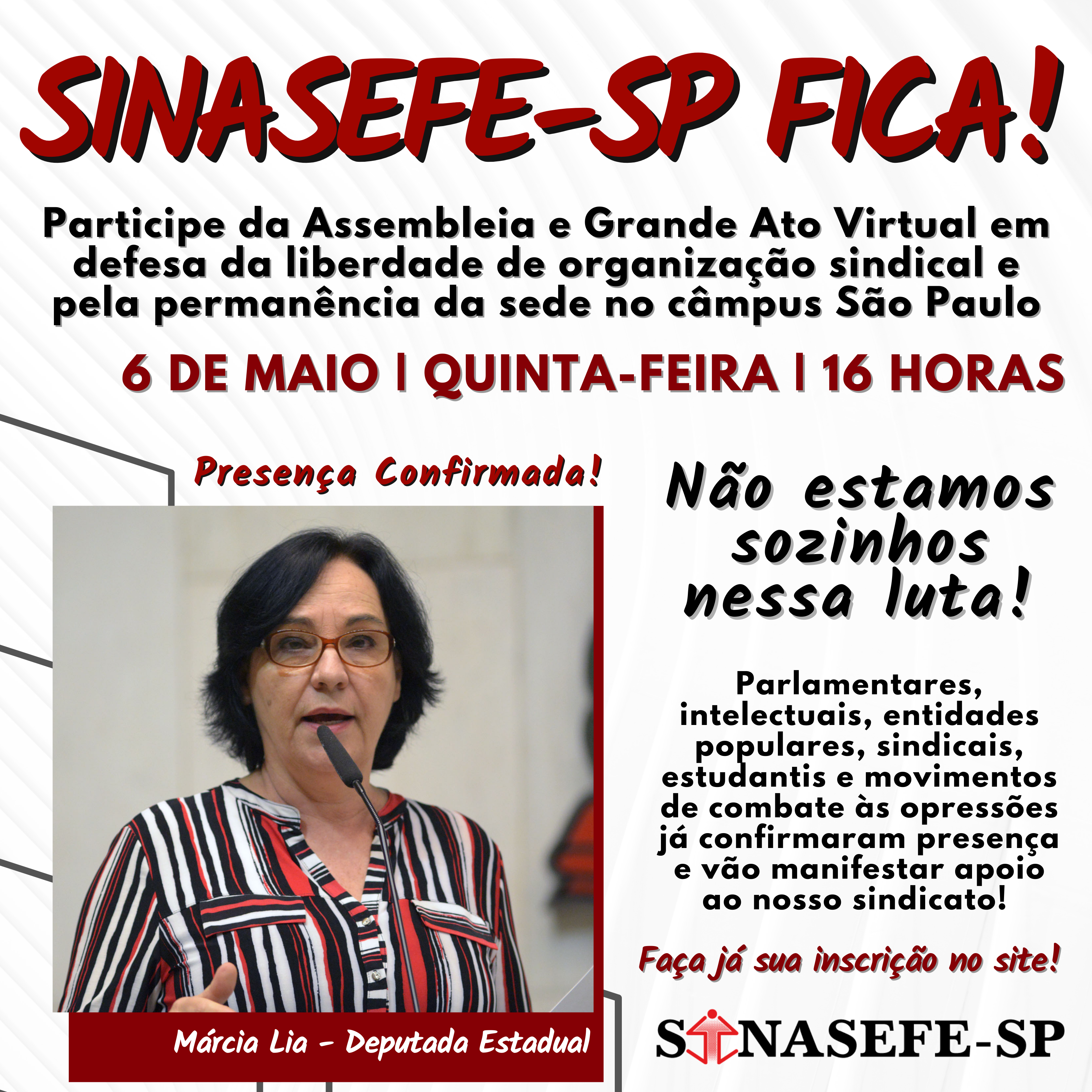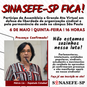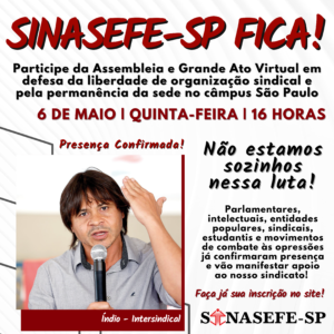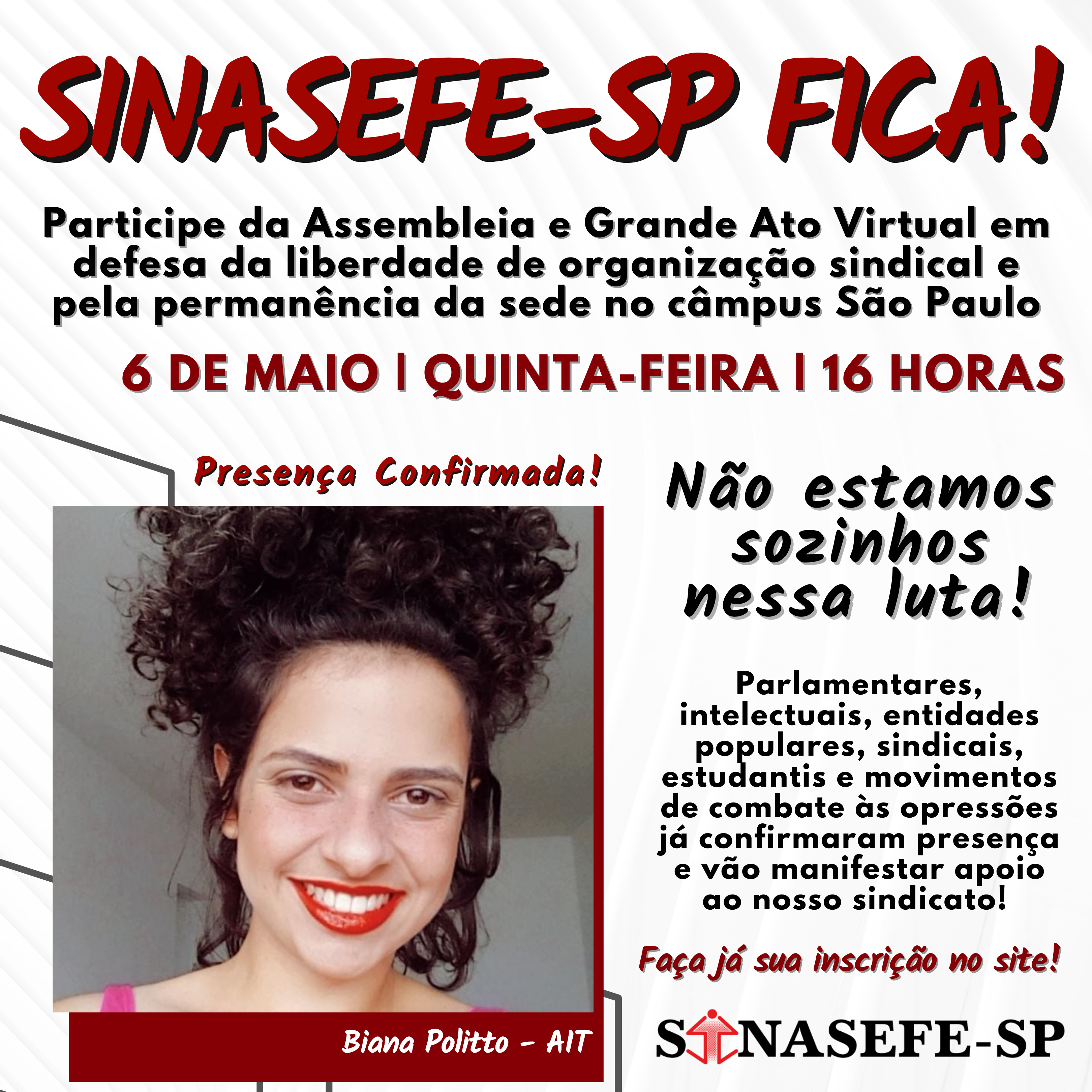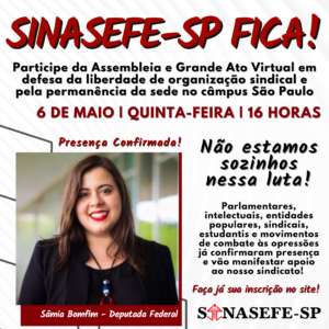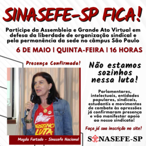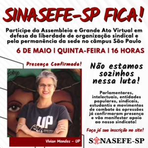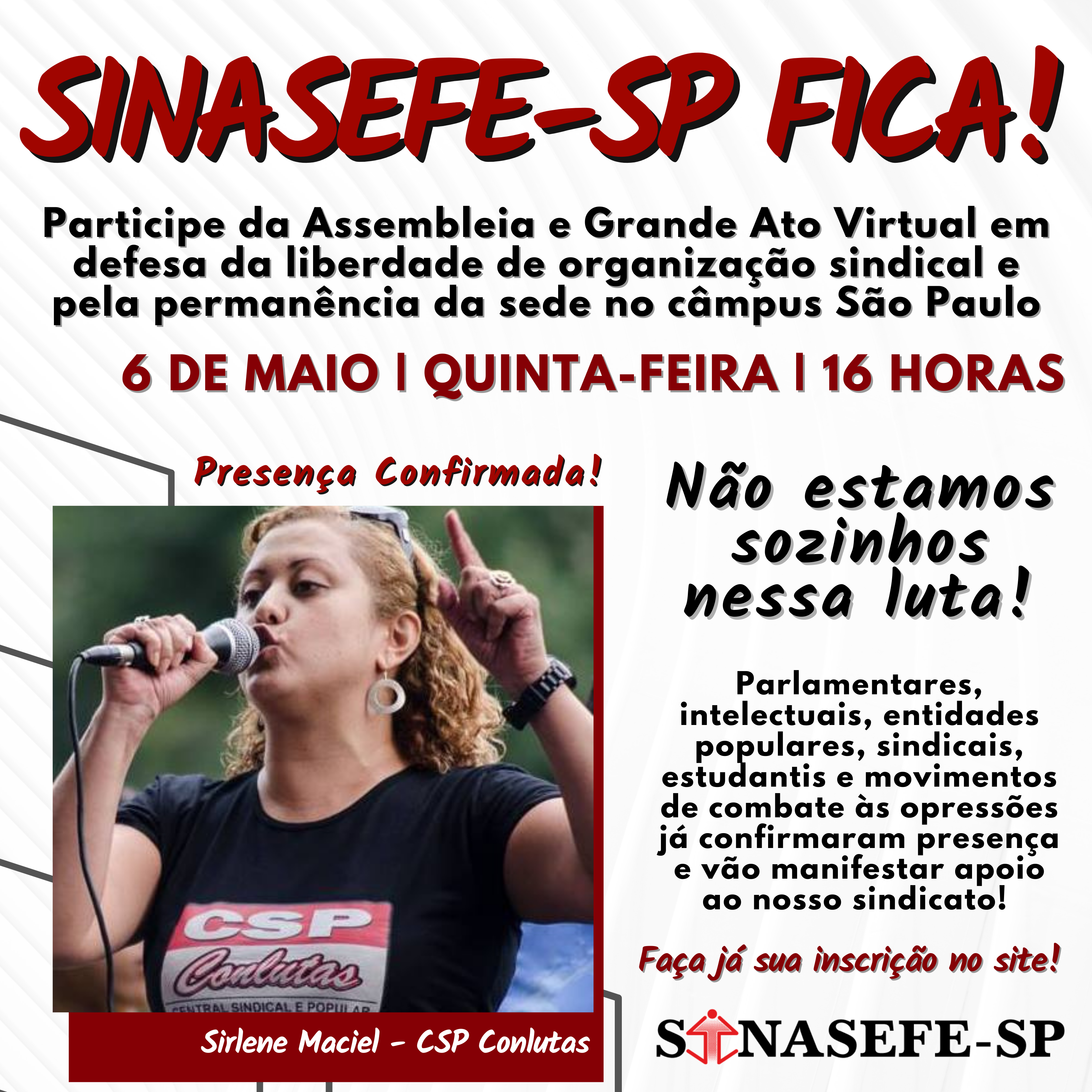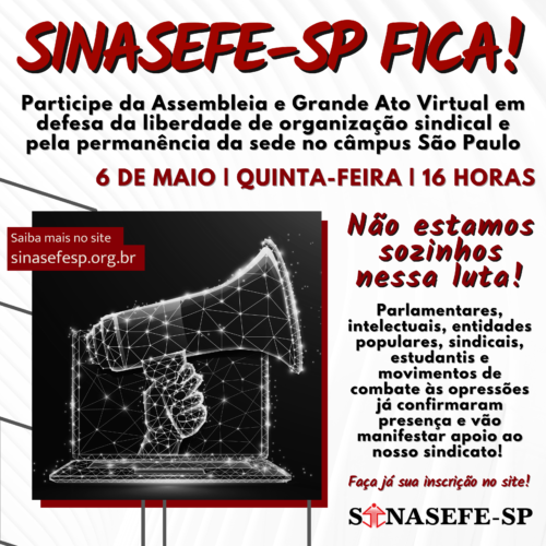 Não estamos sozinhos nessa luta! Nesta quinta-feira, 6 de maio, nossa assembleia será também um grande ato político. Parlamentares, intelectuais, entidades populares, sindicais, estudantis e movimentos de combate às opressões já confirmaram presença e vão manifestar apoio ao nosso sindicato. A nossa resistência já começou: O Sinasefe-SP fica!