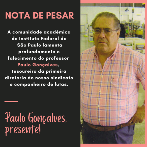 NOTA DE PESAR | A comunidade acadêmica do Instituto Federal de São Paulo lamenta profundamente o falecimento do professor Paulo Gonçalves, tesoureiro da primeira diretoria do nosso sindicato e companheiro de lutas.