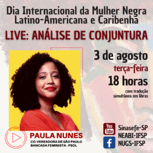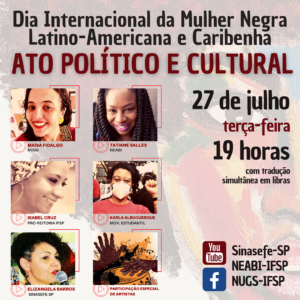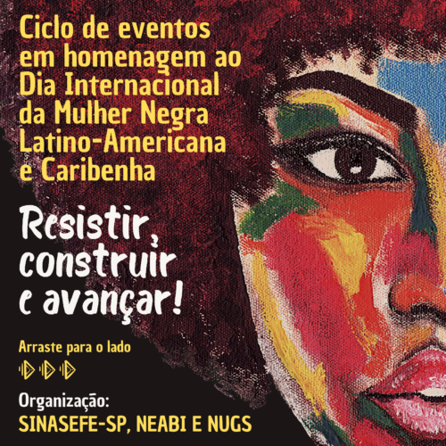 A partir de uma iniciativa conjunta do Sinasefe-SP com os núcleos do IFSP NEABI (Núcleo de Estudos Afro-Brasileiros e Indígenas) e NUGS (Núcleo de Estudos sobre Gênero e Sexualidade), vamos promover um ciclo de eventos virtuais em homenagem ao Dia Internacional da Mulher Negra Latino-Americana e Caribenha: resistir, construir e avançar!