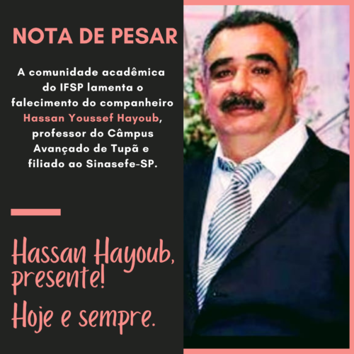 NOTA DE PESAR | A comunidade acadêmica do Instituto Federal de São Paulo lamenta profundamente o falecimento do companheiro Hassan Youssef Hayoub, professor do Câmpus Avançado de Tupã e filiado ao Sinasefe-SP.