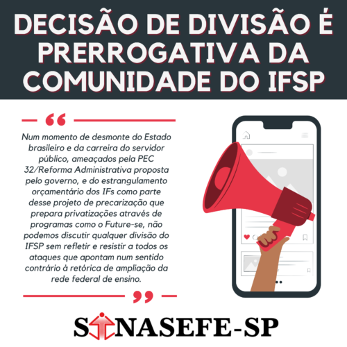 Num momento de desmonte do Estado brasileiro e da carreira do servidor público, ameaçados pela PEC 32/Reforma Administrativa proposta pelo governo, e do estrangulamento orçamentário dos IFs como parte desse projeto de precarização que prepara privatizações através de programas como o Future-se, não podemos discutir qualquer divisão do IFSP sem refletir e resistir a todos os ataques que apontam num sentido contrário à retórica de ampliação da rede federal de ensino.