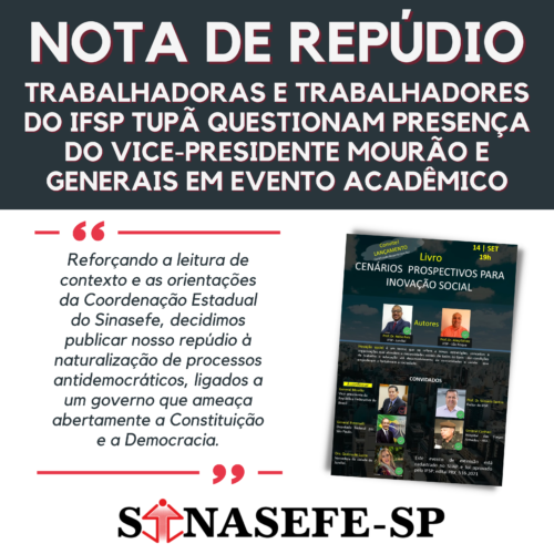 Na última terça, 31/08, nossa Base Sindical reuniu-se e discutiu sobre a participação do vice-presidente Mourão e generais do Exército no evento: “Livro: Cenários Prospectivos para Inovação Social”, sobre a rapidez suspeita em que se articula a divisão dos Institutos Federais em diversas regiões do Brasil, sendo prevista uma divisão do IFSP em mais duas Reitorias. Reforçando a leitura de contexto e as orientações da Coordenação Estadual do Sinasefe, decidimos publicar nosso repúdio à naturalização de processos antidemocráticos, ligados a um governo que ameaça abertamente a Constituição e a Democracia.