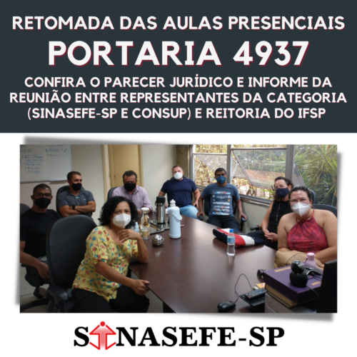 Na última quinta-feira, 9 de setembro, a Coordenação do Sinasefe-SP através dos representantes Denilza Frade, Grazielle Felício e Marival Santana, com a presença da companheira Dione Cabral – representante dos trabalhadores técnico-administrativos no Conselho Superior (CONSUP) – participaram de uma reunião com a gestão da reitoria do IFSP para dialogar acerca da Portaria 4937, que autoriza a retomada das atividades presenciais dos campi e da reitoria do nossa instituição.