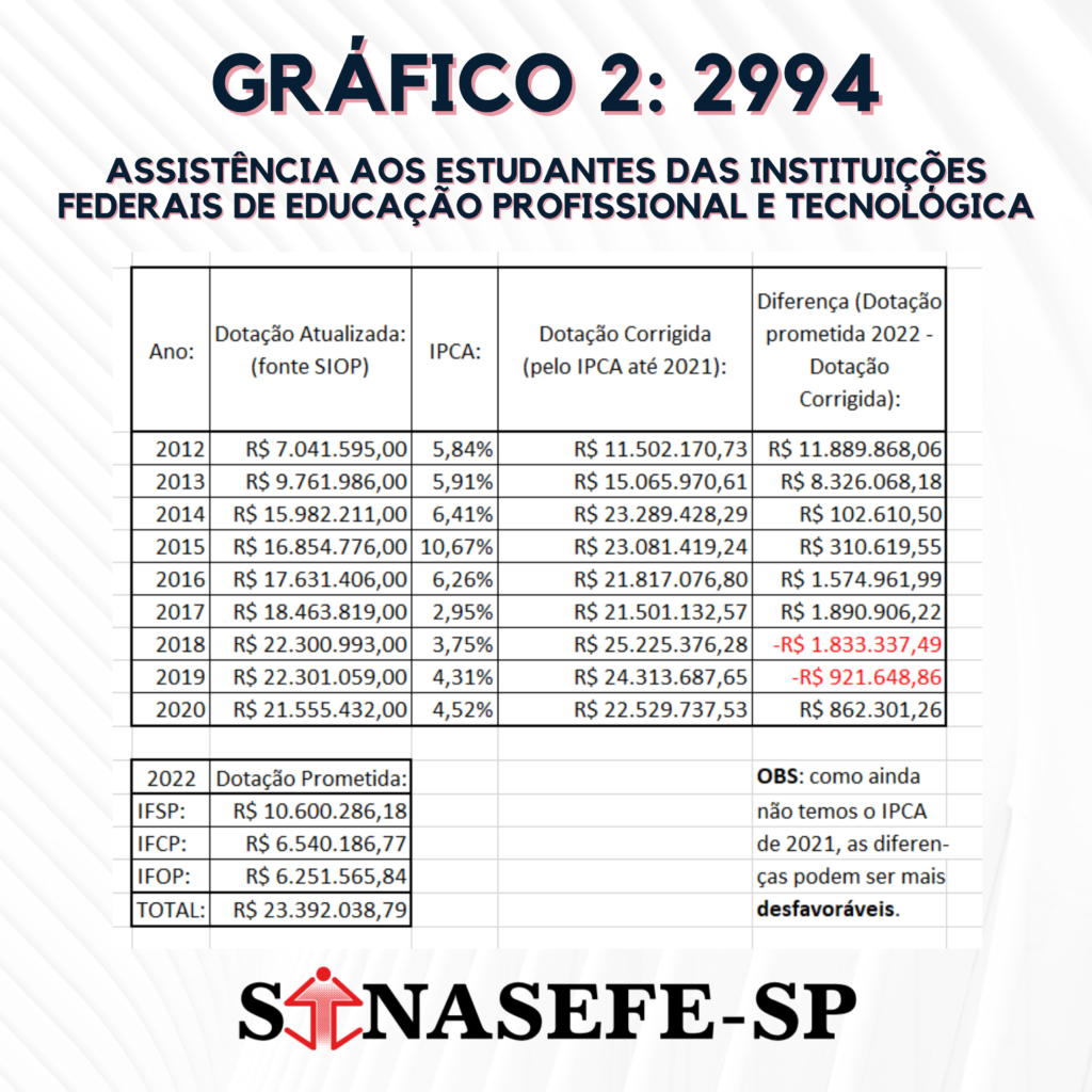 Infelizmente, o IPCA de 2021 não foi considerado, ou seja, a situação apresentada na planilha pode ser ainda mais desfavorável do que está descrito em cada aba. Considerando o orçamento para o funcionamento do IFSP (código 20RL), a dotação prometida para 2022 aos 3 IFs é praticamente metade do que foi dotado em 2014 para um único IF no estado de São Paulo e, no máximo, resgate do orçamento de 2017. Analisando o orçamento para a Assistência Estudantil do IFSP (código 2994), a dotação prometida para 2022 aos 3 IFs é praticamente a mesma de 2020, ou seja, nenhum aumento significativo.