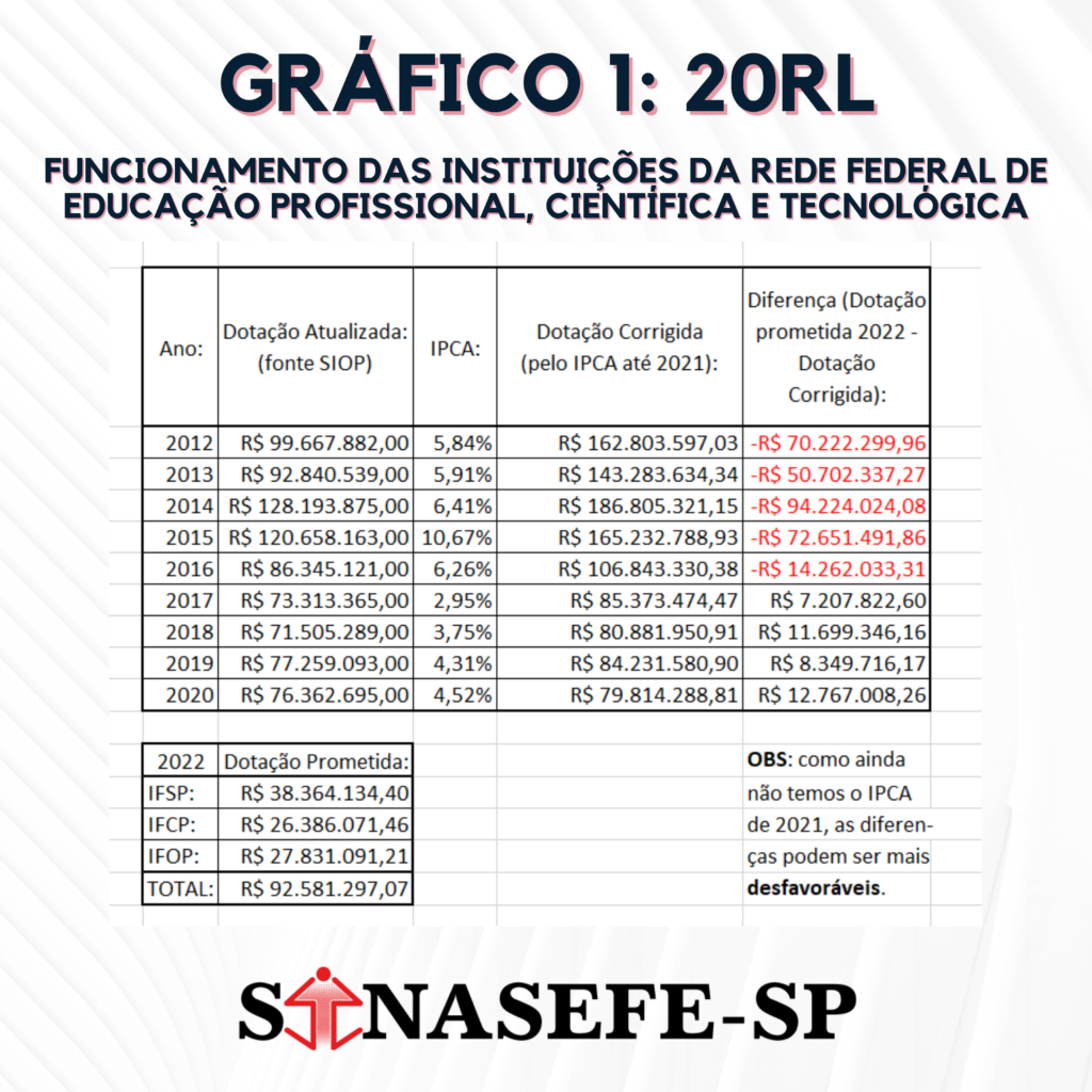 Não foram feitas outras comparações, como, por exemplo, 20RG (Reestruturação e Modernização das Instituições da Rede Federal de Educação Profissional, Científica e Tecnológica) ou 4572 (Capacitação de Servidores Públicos Federais em Processo de Qualificação e Requalificação), porque não foram informadas as dotações prometidas para 2022 aos 3 IFs propostos para o Estado de São Paulo para outras ações orçamentárias.