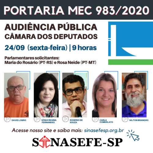 Na próxima sexta-feira, 24 de setembro, às 9 horas, a Comissão de Educação da Câmara Federal discutirá as implicações da Portaria MEC 983/2020. A solicitação partiu das deputadas federais Maria do Rosário (PT-RS) e Rosa Neide (PT-MT) depois de demanda do Sinasefe-SP.