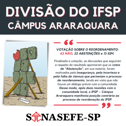 Desse modo, após duas reuniões com a comunidade local, o IFSP – Câmpus Araraquara manifesta posição contrária ao processo de reordenação do IFSP.
