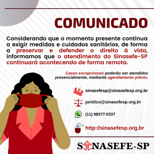 Considerando que o momento presente continua a exigir medidas e cuidados sanitários, de forma a preservar e defender o direito à vida, informamos que o atendimento do Sinasefe-SP continuará acontecendo de forma remota.