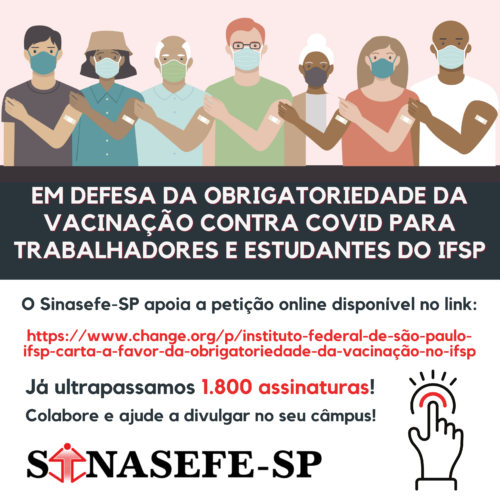 O Sinasefe-SP apoia a exigência do “passaporte da vacina” para todos os servidores e estudantes na retomada das aulas presenciais, em defesa da vida e contra as investidas negacionistas do (des)governo Bolsonaro e seus apoiadores. Convidamos a comunidade do IFSP para acessar petição, assinar e ajudar na divulgação: