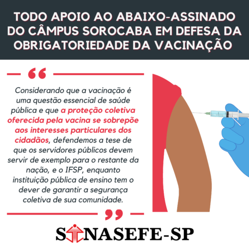A comunidade acadêmica do Câmpus Sorocaba repudia o entendimento da reitoria do IFSP que, de acordo com o setor jurídico da instituição, a exigência da vacinação seria ilegal, na medida em que esta fere o direito induvidual e a privacidade do servidor.