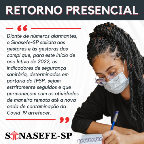 O Sinasefe-SP, implicado no seu compromisso combativo, ético e político na defesa dos direitos da classe trabalhadora, considera fundamental um posicionamento sindical acerca da necessidade do retorno presencial para este início do ano letivo de 2022, sobretudo considerando os elementos que acirram a pandemia do Covid-19 na atual conjuntura, tendo em vista a proliferação da doença a partir da variante ômicron do SARS-Cov-2.