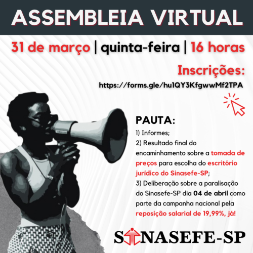 3) Deliberação sobre a paralisação do Sinasefe-SP dia 04 de abril como parte da campanha nacional pela reposição salarial de 19,99%, já!
