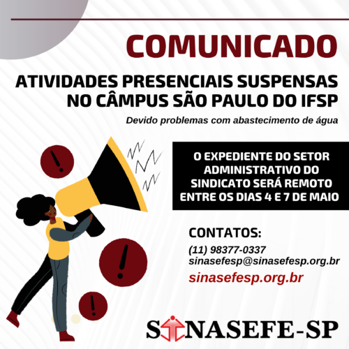 Devido problemas de abastecimento de água, o expediente presencial na sede do Sinasefe-SP está suspenso entre os dias 4 e 7 de maio.