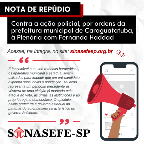 O Sinasefe-SP, sindicato que representa os trabalhadores do IFSP, manifesta publicamente repúdio à ação arbitrária e antidemocrática praticada pela gestão municipal do prefeito Aguilar Júnior (MDB), com apoio da Polícia Militar. Manifestamos ainda, incondicional solidariedade aos servidores do IFSP Caraguatatuba envolvidos na organização do evento, bem como ao Diretório Municipal do PT Caraguatatuba e a toda população por vivenciarem esse vergonhoso ataque aos direitos e liberdades.