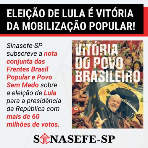 Eleição de Lula é vitória da mobilização popular! | Sinasefe-SP subscreve a nota conjunta das Frentes Brasil Popular e Povo Sem Medo sobre a eleição de Lula para a presidência da República com mais de 60 milhões de votos.
