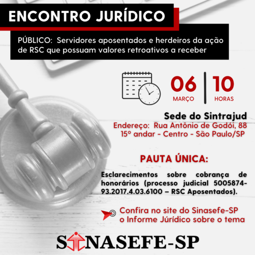 ENCONTRO JURÍDICO | O Sinasefe-SP convoca os aposentados do IFSP que possuam valores a receber referentes ao retroativo do processo de Reconhecimento de Saberes e Competências (RSC) para uma reunião presencial com a assessoria jurídica do Escritório Marcos Rogério & Moreth Advocacia.
