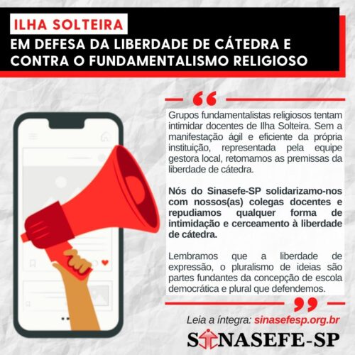 Nós do Sinasefe-SP solidarizamo-nos com nossos(as) colegas docentes e repudiamos qualquer forma de intimidação e cerceamento à liberdade de cátedra. Lembramos que a liberdade de expressão, o pluralismo de ideias são partes fundantes da concepção de escola democrática e plural que defendemos.