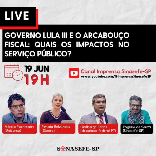 Na segunda-feira (19), às 19h, Márcio Pochmann (Unicamp), Renata Belzunces (Dieese), Lindbergh Farias (deputado federal PT) e Rogério de Souza (Sinasefe-SP) participam de debate ao vivo sobre os impactos do arcabouço fiscal no serviço público.