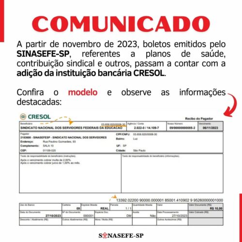 Informamos a todas e todos sindicalizados(as) do Sinasefe-SP que, a partir de novembro de 2023, boletos bancários emitidos pelo Sindicato, referentes a planos de saúde, contribuição sindical e outros, passam a contar com a adição da instituição bancária CRESOL (Cooperativa de Crédito), além do SICOOB.