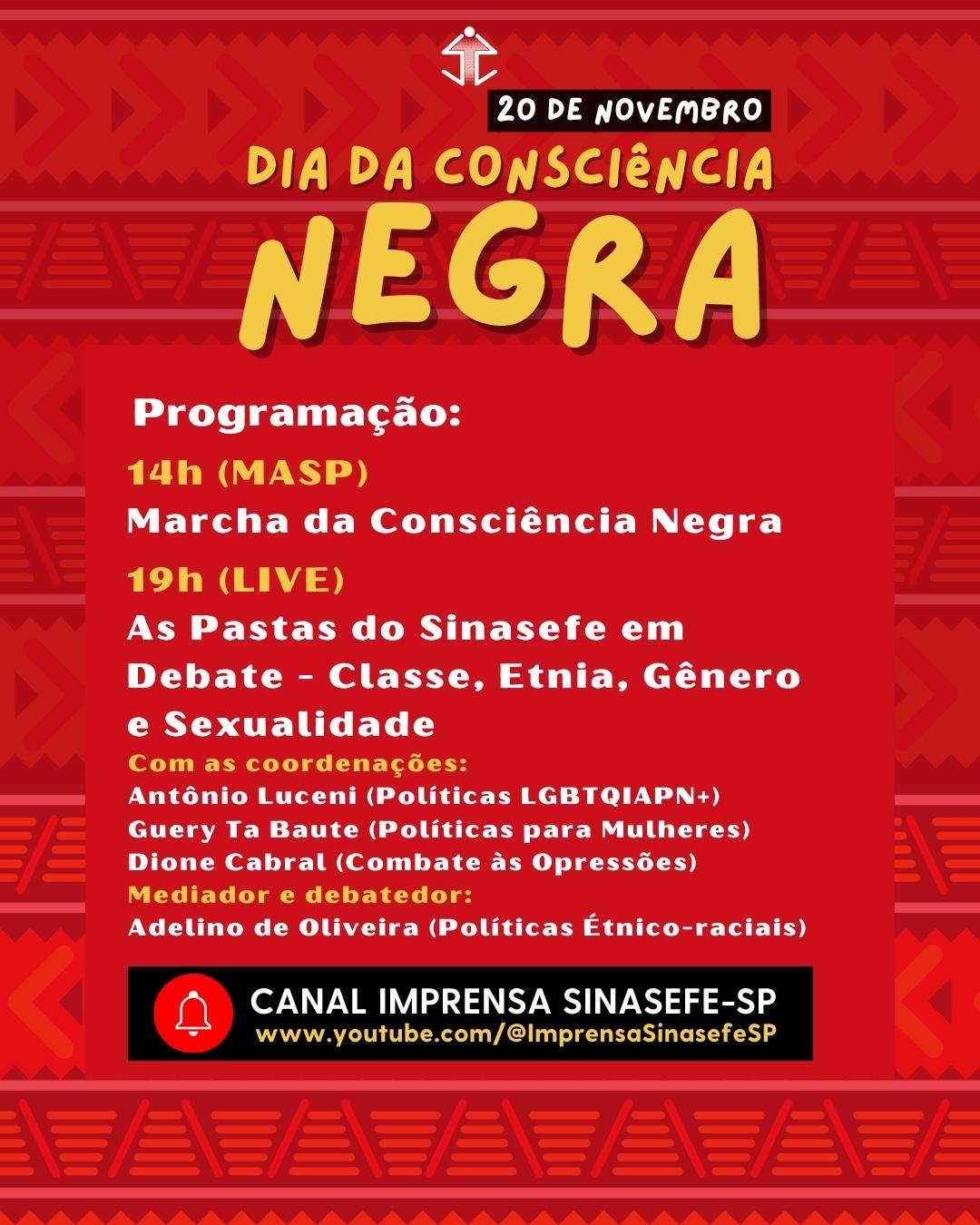 Mais tarde, às 19 horas, o Sinasefe-SP vai realizar um bate-papo ao vivo, com mediação do nosso coordenador de Políticas Étnico-raciais Adelino Francisco de Oliveira. Também participam da Live Antonio Luceni (coord. de Políticas LGBTQIAPN+), Guery Ta Baute (coord. de Políticas para Mulheres), Dione Cabral (coord. de Combate às Opressões).