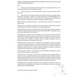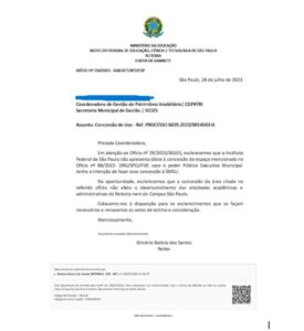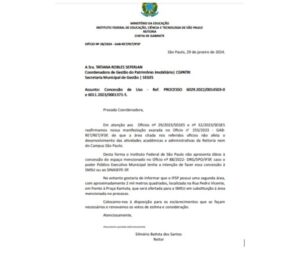 Após sucessivas reuniões no final de 2023 e janeiro de 2024 com a coordenação do SINASEFE-SP, o reitor do IFSP justificou que em julho de 2022 encaminhou um ofício dizendo que não via obstáculo na cessão da área à Secretaria Metropolitana de Segurança Urbana, mas demonstrou desconhecimento sobre diferentes informações e detalhamento do processo de cessão de quase 5 mil metros quadrados do campus São Paulo para as forças de segurança.