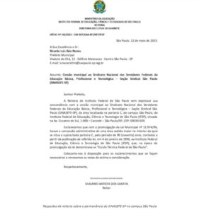 Assim, realçando a importância da presença do sindicato no IFSP, a concordância acordada verbalmente e por escrito do atual Reitor e Diretor de Campus, o bom equacionamento da movimentação e segurança na região apontado acima, reforçamos o pedido de cessão municipal já feito oficialmente, autorizando o funcionamento do Sindicato Nacional dos Servidores Federais da Educação Básica, Profissional e Tecnológica na área que o SINASEFE-SP levantou uma construção e que, atualmente, encontra-se em fase final de acabamento.