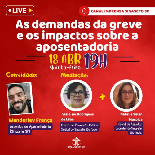 Nesta quinta-feira, 18/04, às 19h , o coordenador da pasta de Assuntos de Aposentadoria _Wanderley França_ irá discutir sobre a relação entre salário e aposentadoria nas carreiras EBTT e TAE e a urgência desta greve. Participem! 📣