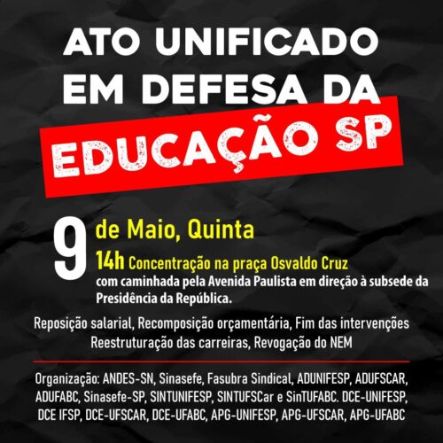 Organizam o Ato unificado em defesa da Educação: ANDES-SN, Sinasefe, Fasubra Sindical, Adunifesp, Adufscar, AdufABC, Sinasefe-SP, Sintunifesp, Sintufscar, SintufABC. DCE-Unifesp, DCE-IFSP, DCE-UFSCar, APG-Unifesp, APG-UFSCar, APG-UFABC.